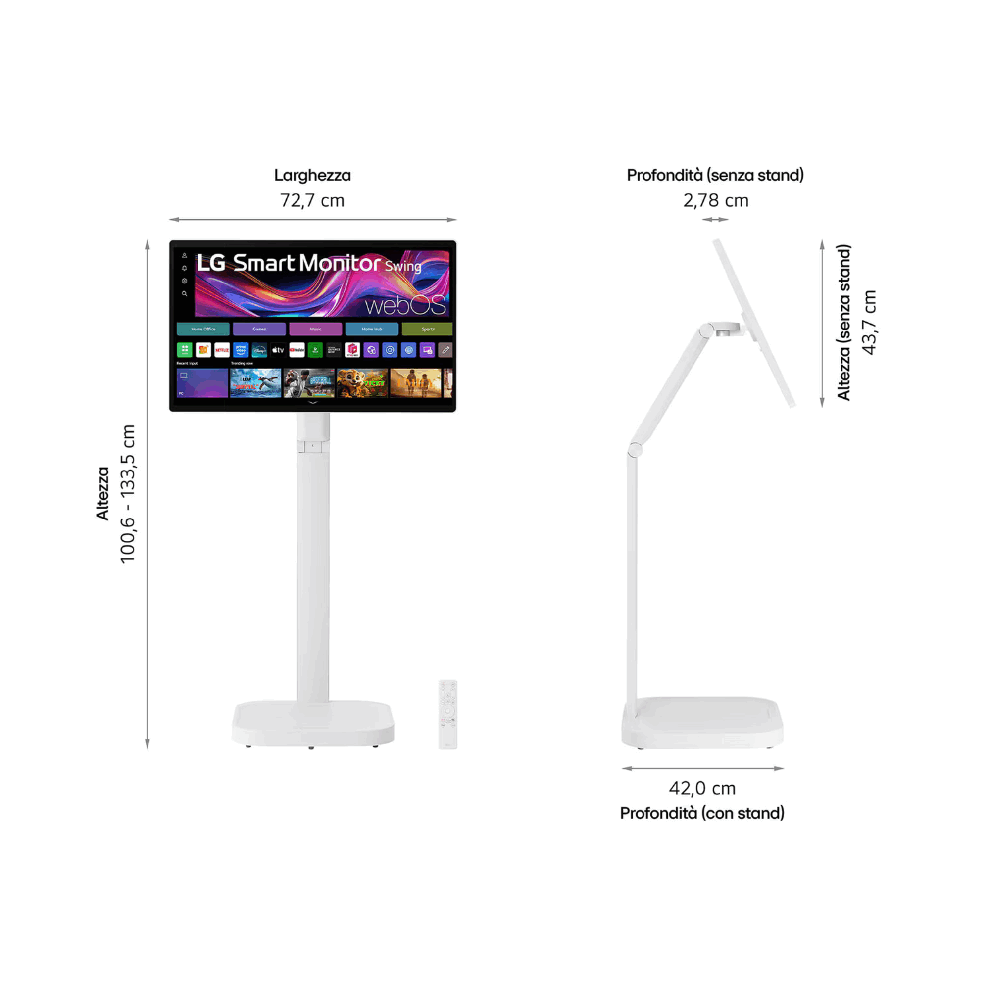 Scopri un nuovo concetto di schermo, pensato per rivoluzionare il tuo spazio. LG Swing è l'innovativo schermo personale dotato di una base con rotelle per portarlo ovunque tu voglia, display touch 4K da 32" regolabile e webOS per goderti i tuoi contenuti preferiti.