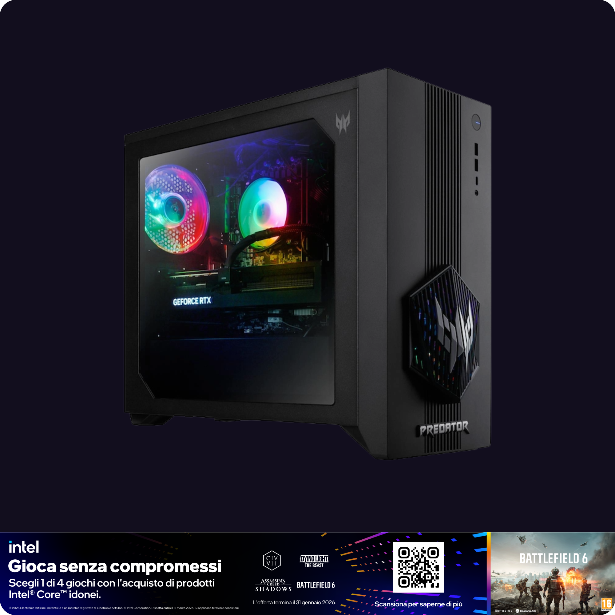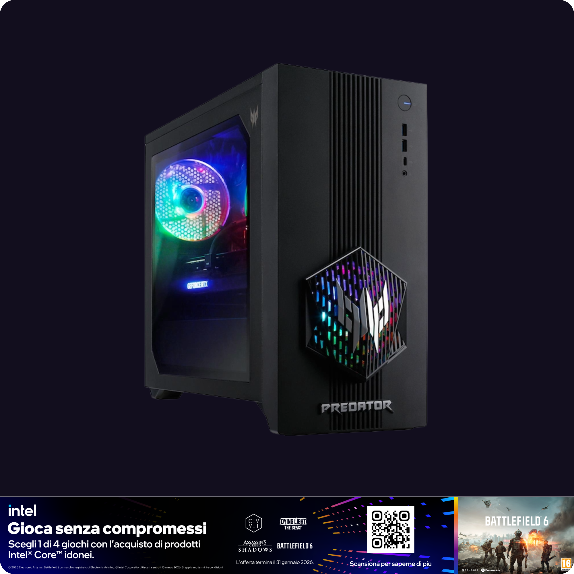 In un mondo in cui lo spazio è scarsissimo e la potenza è tutto, il Predator Orion 3000 da 28 litri unisce forza pura e precisione dell'IA in un formato compatto. Progettato per comandare grazie al processore Intel® Core™ Ultra 7 265F e alla grafica NVIDIA® GeForce RTX™ 50