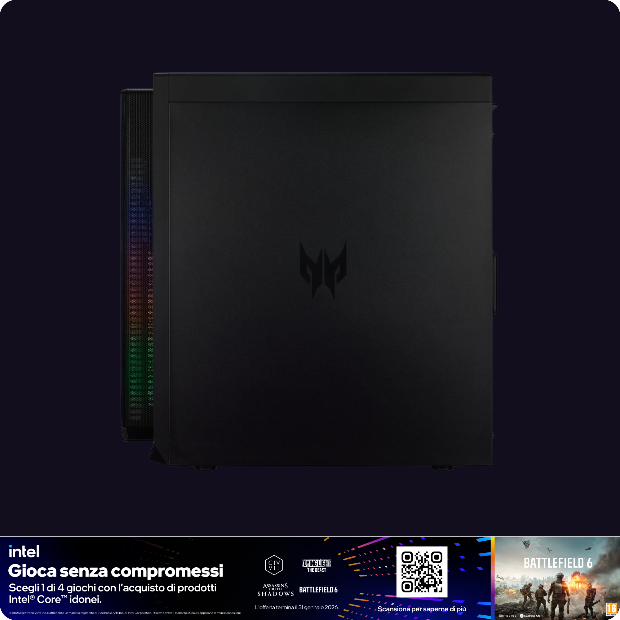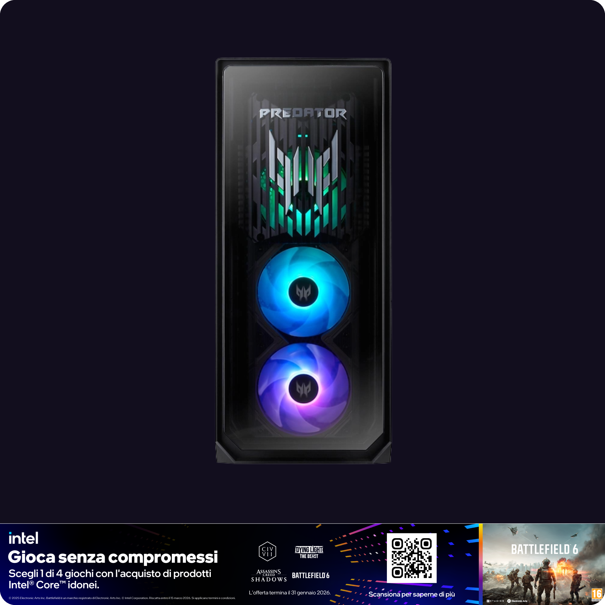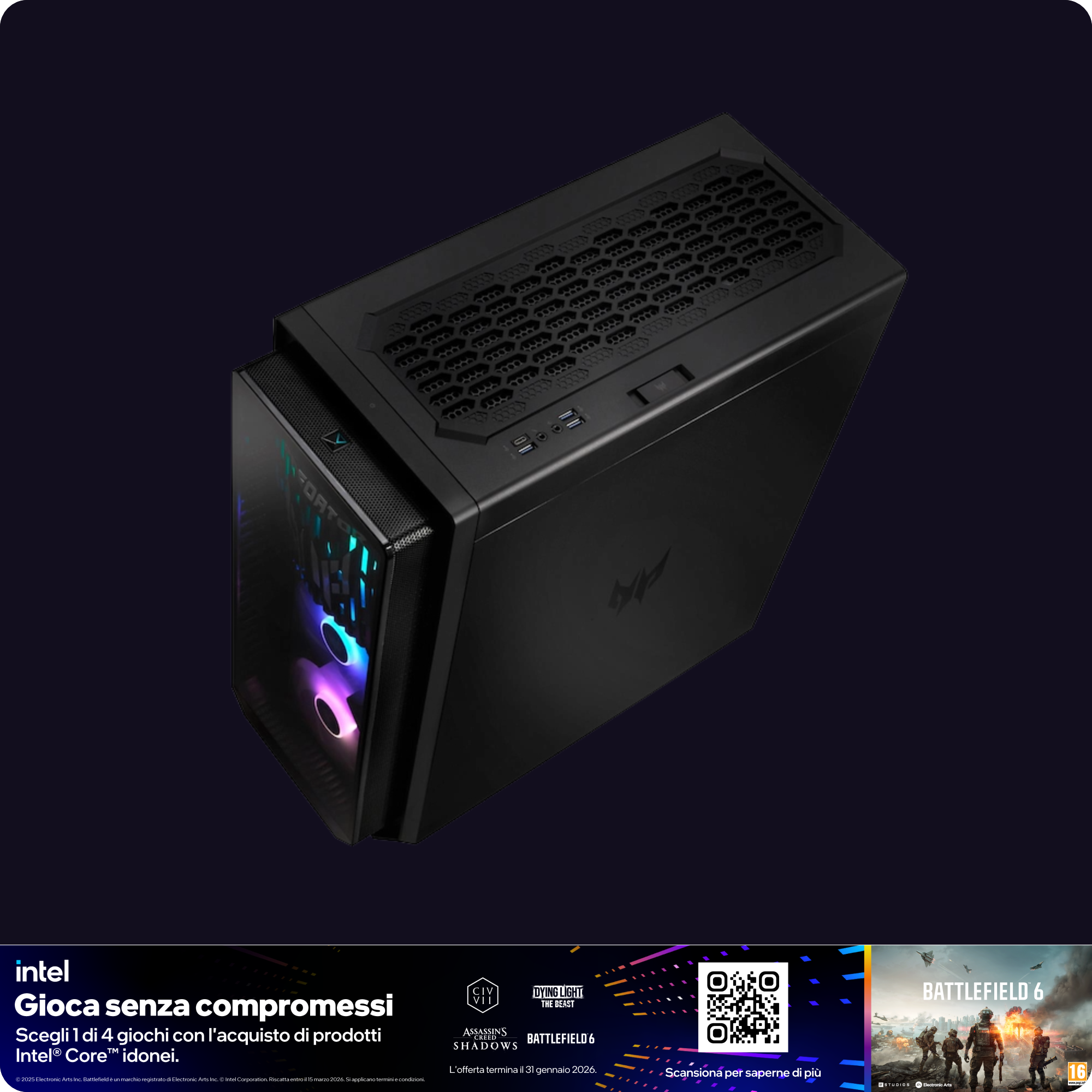 Predator Orion 7000, equipaggiato con processori Intel® Next-Gen Arrow Lake, è la tua chiave di accesso a un universo di prestazioni illimitate. Progettato per i temerari, questo desktop da battaglia annienta ogni sfida. Con l'innovativo sistema di raffreddamento CycloneX 360 e l'illuminazione ARGB personalizzabile, questo desktop non è un semplice PC: è un'affermazione di potenza. Entra nella nuova era di supremazia nel gaming.