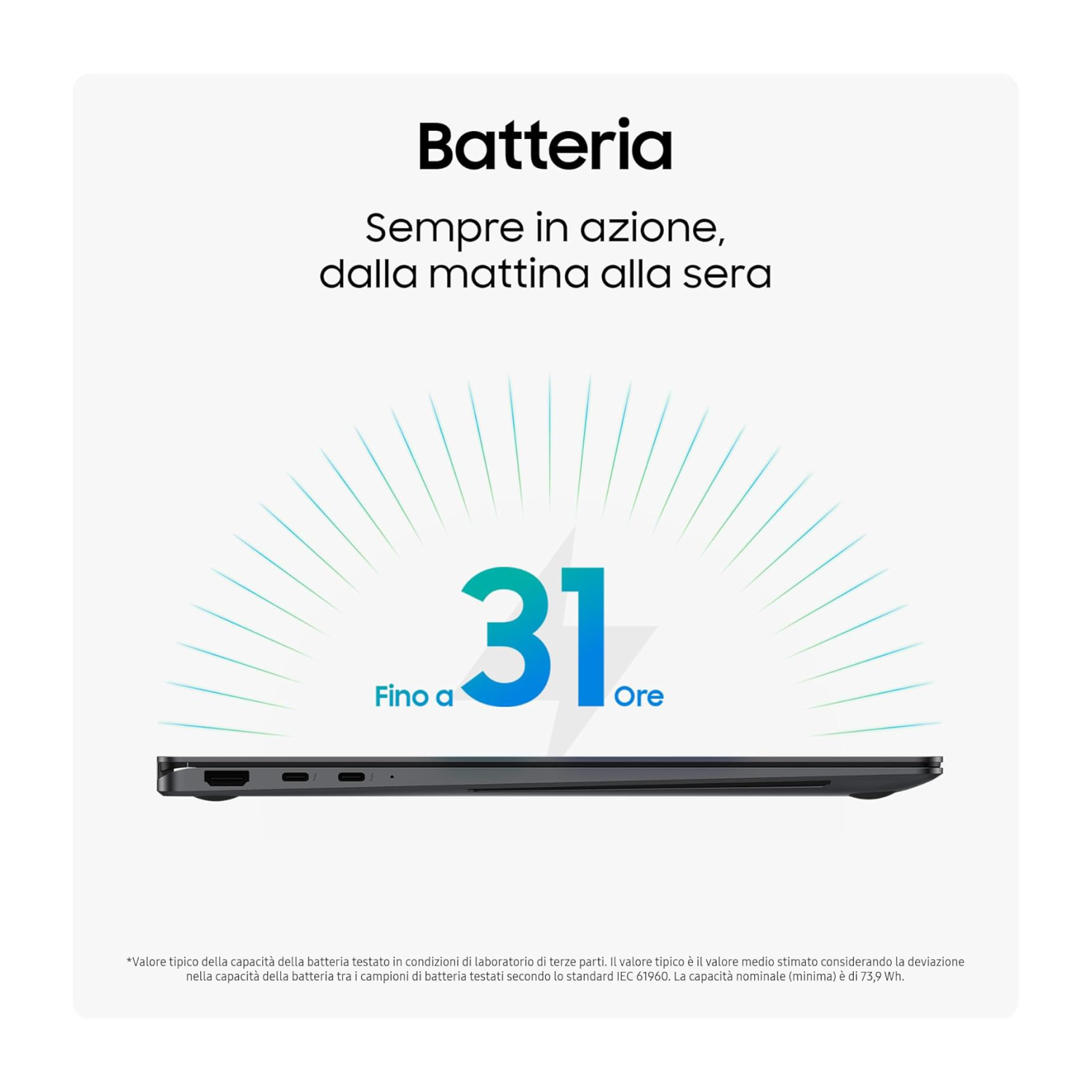 Sempre in azione, dalla mattina alla sera: La produttività è assicurata: con una sola ricarica della batteria a lunga durata di Galaxy Book5 360 avrai fino a 31 ore di autonomia video. Per ricaricarla, collega il caricabatterie compatto USB-C e raggiungi il 39% in soli 30 minuti con la ricarica rapida.