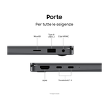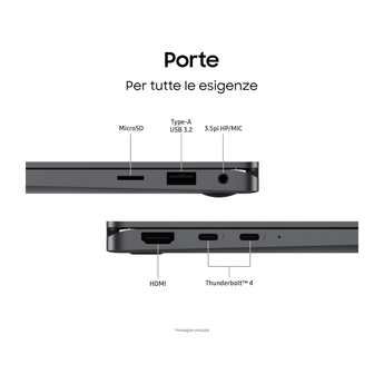 Collegamento immediato: Galaxy Book5 360 è dotato di un'ampia serie di porte. Collega facilmente i dispositivi essenziali alla tua workstation grazie alle due porte Thunderbolt 4 integrate, alla porta HDMI, alla porta USB-A, allo slot per schede microSD e al jack per cuffie/microfono.