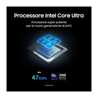 Il nuovo Galaxy Book5 Pro, supportato da una NPU avanzata, è pensato per le funzionalità intelligenti di Galaxy AI. Grazie al velocissimo processore Intel® Core™ Ultra (serie 2) può gestire volumi di lavoro AI intensi e, grazie alla lunga durata della batteria, resta sempre carico sulla strada verso il successo.
