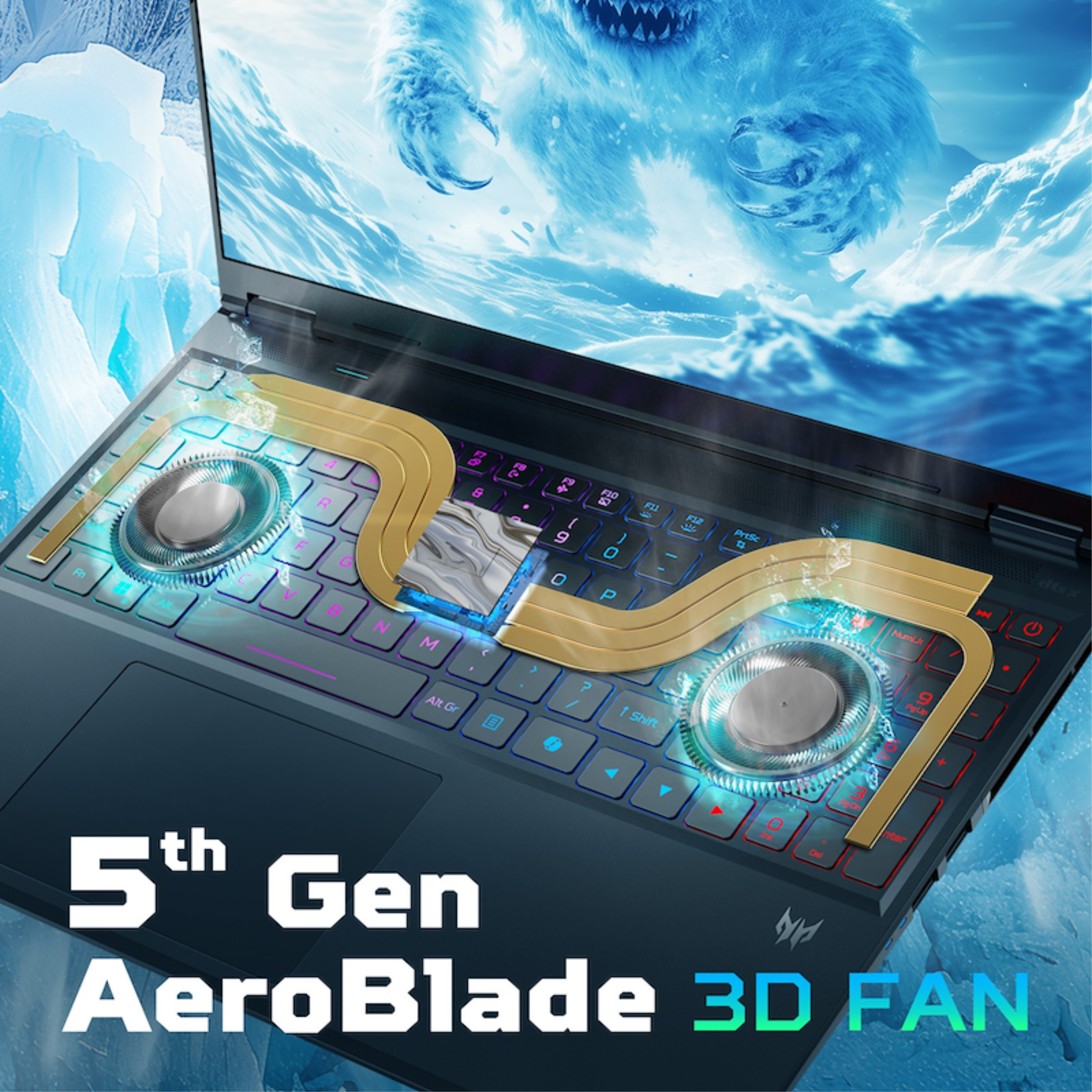 SOLUZIONI TERMICHE AVANZATE: Ventola AeroBlade 3D di quinta generazione. Con 89 pale eccezionalmente sottili da 0,08 mm e un'innovativa struttura di guida del vento, la ventola AeroBlade™ 3D di quinta generazione raggiunge un notevole incremento del 10% nelle prestazioni del flusso d'aria rispetto alla ventola AeroBlade™ 3D di quarta generazione. Il grasso termico in metallo liquido, un materiale di interfaccia termica utilizzato per migliorare la connessione termica tra due componenti, vanta una conduttività termica superiore rispetto ai suoi concorrenti nel mercato del grasso termico. La sua applicazione precisa si traduce in un trasferimento di calore più efficace, contribuendo all'ottimizzazione delle prestazioni della CPU.